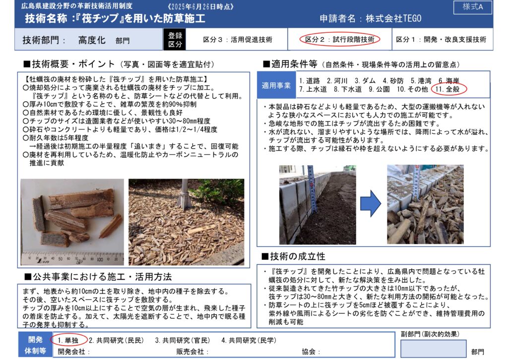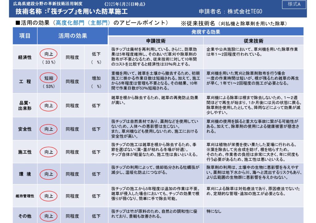 このたび、当社の防草資材『筏チップ』が、「広島県 建設分野の革新技術活用制度」において、