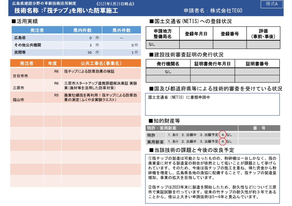 『広島県 建設分野の革新技術活用制度』に「筏チップ」が登録されました
